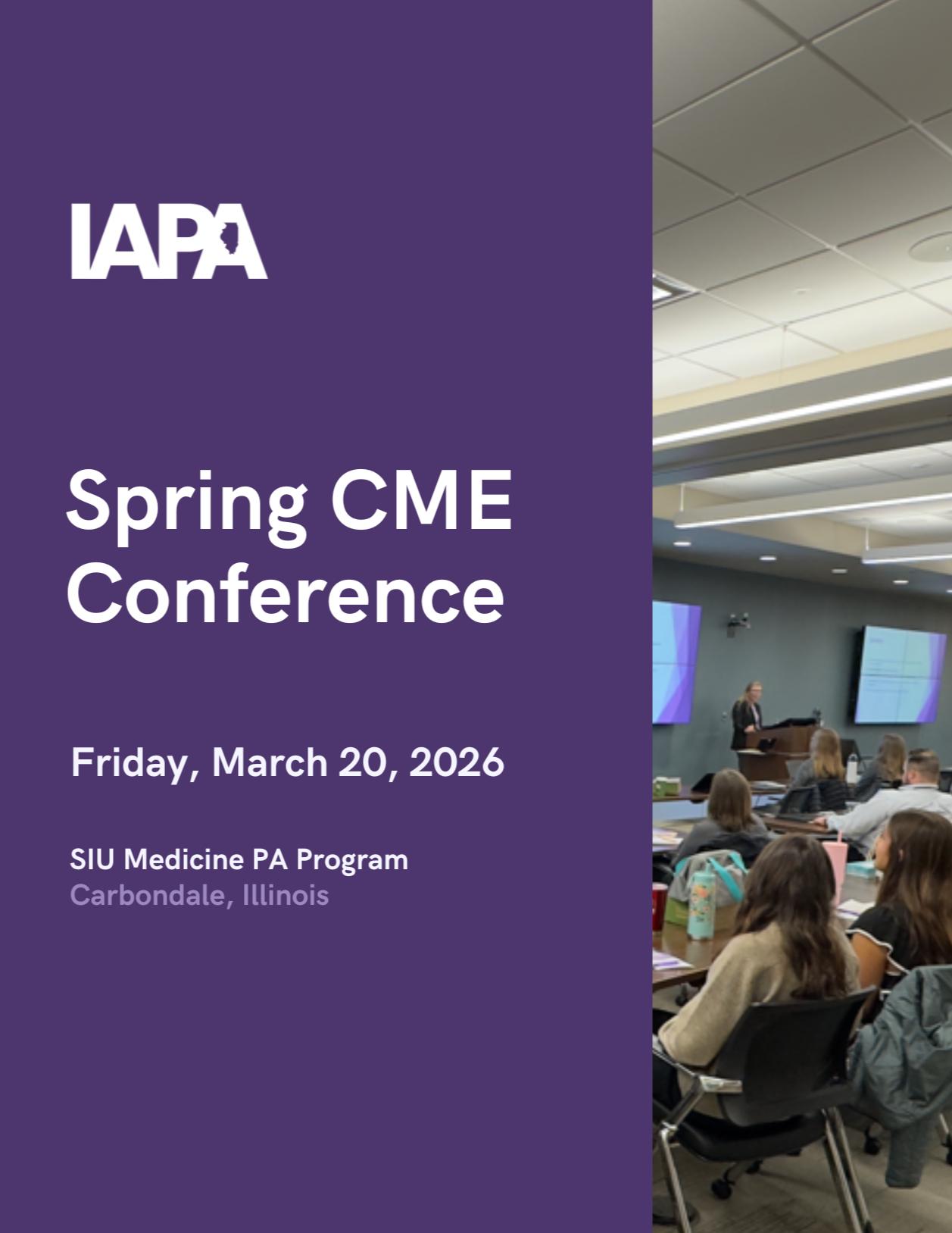Join us for the Illinois Academy of PAs (IAPA) Spring CME Conference on March 21, 2025, in Carbondale! This one-day event brings together PAs and other healthcare professionals for high-quality continuing education, networking, and professional growth. Featuring expert-led sessions on the latest clinical updates, legislative advocacy, and PA practice advancements, this conference is designed to enhance your skills and expand your professional connections. Don't miss this opportunity to earn CME credits while engaging with colleagues from across Illinois. Register today and be part of the future of PA practice in our state!